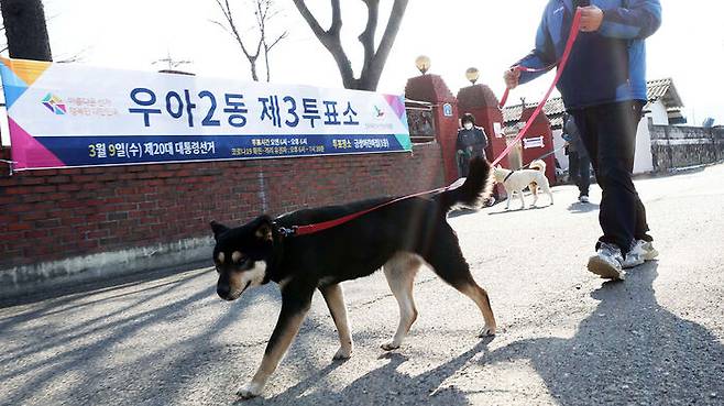 제20대 대통령선거일인 9일 오전 학장동제1투표소에서 반려견과 함께 온 시민이 투표하고 있다.