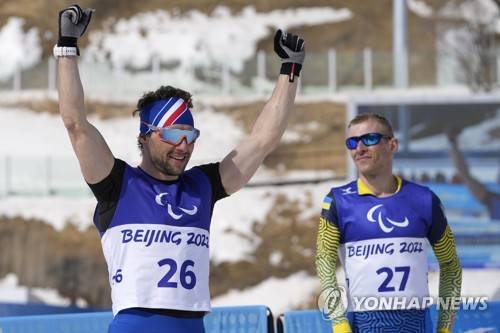 Winner Benjamin Daviet, left, of France, reacts as third placed Grygorii Vovchynskyi of Ukraine looks on during a ceremony for the men's sprint free technique standing final of para cross country skiing at the 2022 Winter Paralympics, Wednesday, March 9, 2022, in Zhangjiakou, China. (AP Photo/Shuji Kajiyama)