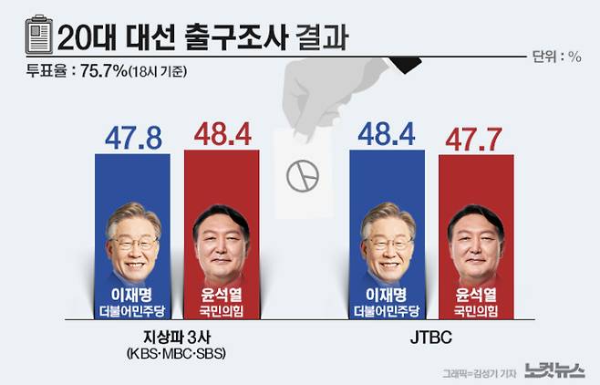 20대 대통령 선거의 방송3사 출구조사 결과 20대 지지율에서 더불어민주당 이재명 후보가 국민의힘 윤석열 후보를 앞선 것으로 나타났다.