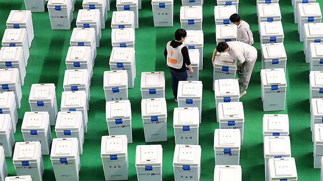 제20대 대통령선거일인 9일 오후 강원 춘천시 호반체육관에서 개표사무원들이 투표함을 옮기고 있다.