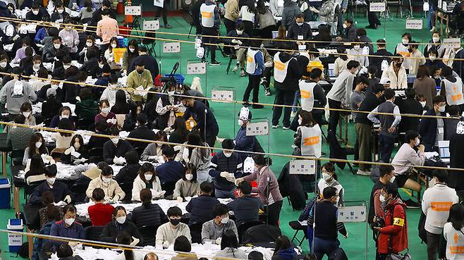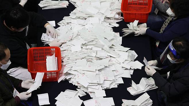 9일 오후 서울 영등포구 영등포다목적배드민턴체육관에 마련된 제20대 대통령선거 개표소에서 개표 작업이 진행되고 있다.