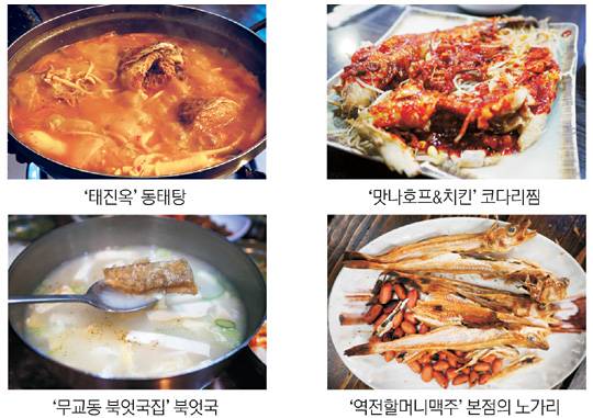 ◇태진옥 = 낮에는 밥을 팔고 저녁엔 고기와 술을 차리는 집. 예전엔 생태를 했지만 재료가 사라진 요즘은 동태탕을 끓인다. 투실한 살 토막을 툭툭 던져 넣고 붉게 양념한 동태탕을 보글보글 끓여 낸다. 전골식이라 오래 끓일수록 시원한 동태 국물 맛이 살아난다. 어떤 전골에도 라면사리를 곁들이는 것은 이 집 단골들이 정한 무언의 약속이다. 서울 중구 무교로 17-25. 1만2000원.