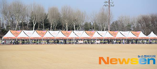 이날 관객들이 입장에 앞서 본인 확인 부스를 일렬로 지나고 있다.