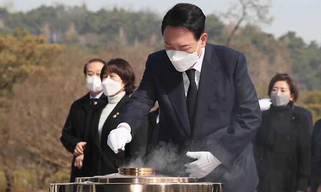 | 당 지도부와 함께 윤석열 대통령 당선인이 10일 서울 동작구 국립서울현충원에서 분향하고 있다. 남제현 선임기자 |