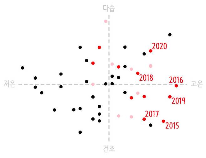 올해만 특별한 게 아닙니다. 우리나라의 평균 기온과 전체 강수량으로 기상 상황의 변화를 살펴볼게요. 1973년부터 2020년까지 대한민국 평균 기온(X축)과 총 강수량(Y축)으로 점을 찍어봤습니다. 48년 간의 평균 기온과 강수량을 기준으로 4개 구역으로 나눠보면 분홍색 점(2000년 이후)과 빨간색 점(2010년 이후)이 우측에 몰려있는 게 보일 거예요. 특히 2010년 이후엔 오른쪽 하단에 위치하는 모습이 뚜렷합니다. 그러니까 최근으로 올수록 대한민국이 따뜻해지고 건조해지고 있다는 거죠.