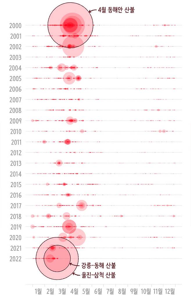 역대 산불과 비교하면 이번 산불은 어느 정도의 피해를 준 걸까요? 산림청에서는 체계적인 산불 관리를 위해서 산불피해대장을 작성하고 있습니다. 여기에는 산불이 언제, 어디서 발생했고 원인은 무엇인지, 그리고 피해 면적은 얼마인지 구체적으로 정리되어 있는데 이 자료를 바탕으로 그래프를 그려봤습니다. 위의 그래프에서 원의 크기는 해당 산불의 피해 면적을 나타냅니다. 2000년 동해안 산불의 거대한 원이 가장 상단에 위치해있죠? 올해 산불은 현재까지 파악된 잠정 수치로 그려본 거지만, 2000년 산불과 버금가는 규모라는 게 느껴질 겁니다.