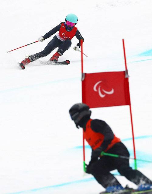 알파인 스키 시각장애 부문은 장애인 선수와 비장애인 가이드 러너가 팀을 이뤄 함께 달립니다.