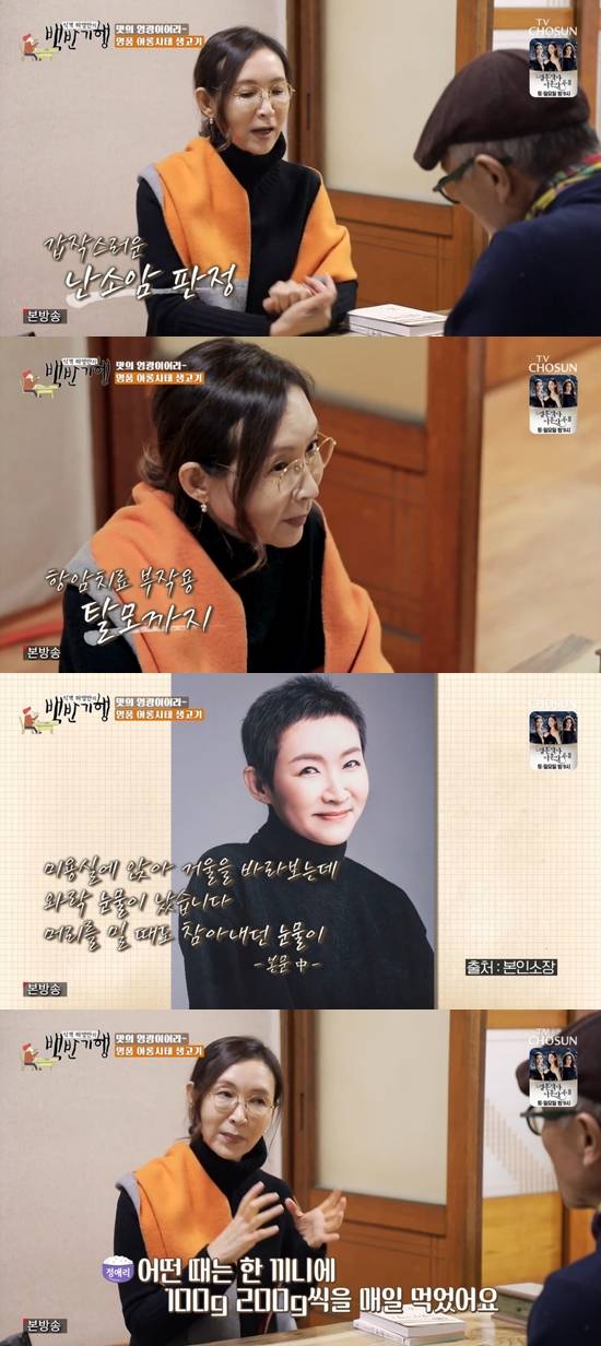 항암 당시를 떠올린 정애리는 "항암을 견디려면 단백질을 많이 먹어야 했다. 특별히 고기를 많이 먹으라고 해서 매일 200g 씩 먹었다. 한 끼니에 100g, 200g을 먹기도 했다. 꽤 많이 먹었다"고 말했다. 허영만은 "고생 많이 했겠다"며 안타까워했다.