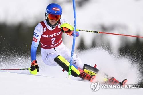 epa09818702 Mikaela Shiffrin of the USA in action during the first run of the women's slalom race at the FIS Alpine Ski World Cup in Are, Sweden, 12 March 2022. EPA/PONTUS LUNDAHL SWEDEN OUT
