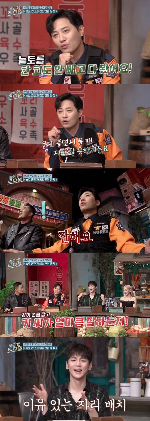 12일 밤 방송된 케이블채널 tvN 예능 프로그램 ‘놀라운 토요일’(이하 ‘놀토’)에는 OCN 드라마 ‘우월한 하루’에 출연하는 배우 진구와 하도권이 출연했다.