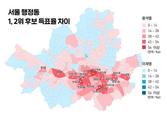 특히 한강을 옆에 두고 있는 동네에서 윤석열 후보의 우세가 뚜렷한데요. 대표적으로 압구정동, 청담동, 반포2동 등입니다. 숫자와 함께 볼까요? 당선된 윤 후보가 가장 압도적으로 앞선 건 강남구 압구정동인데 두 후보의 득표율 차이는 70.6%p, 그 뒤로 강남구 대치1동 63.8%p, 강남구 도곡2동 63.6%p 등 순입니다. 말 그래도 윤 후보에게 표를 몰아줬다고 봐도 무방할 정도입니다.