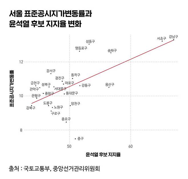 윤 후보가 높은 득표율을 기록한 곳에는 어떤 공통점이 있을까요? 바로 이곳은 서울 안에서 가장 비싼 동네란 겁니다. 거칠게 2022년 서울 표준 공시지가 상승률과 윤 후보 지지율 간의 상관관계를 보면 확연히 윤 후보의 득표율은 설명이 어느 정도 가능합니다. 서초, 송파, 성동, 영등포구의 표심과 집값은 더욱 연동됩니다. 성동에서는 옥수동 제2투표소와 4투표소에서 윤석열 후보가 각 67.55%, 71.02%로 가장 높았는데 해당 투표소는 옥수극동아파트, 옥수동삼성아파트, 래미안옥수리버젠 일부 주민이 투표한 것으로 나타납니다.