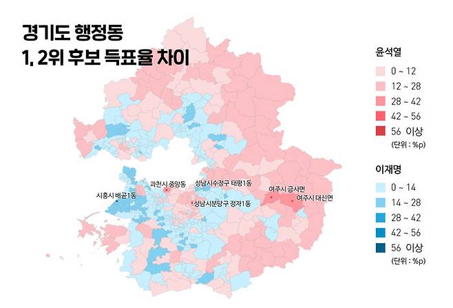 서울과 이웃하는 고양시, 남양주시, 구리시, 성남시, 시흥시 등에 속한 행정동에서는 이재명 후보 지지율이 높았지만 반대로 경기 외곽 지역에서는 윤석열 후보의 득표율이 앞섰습니다.