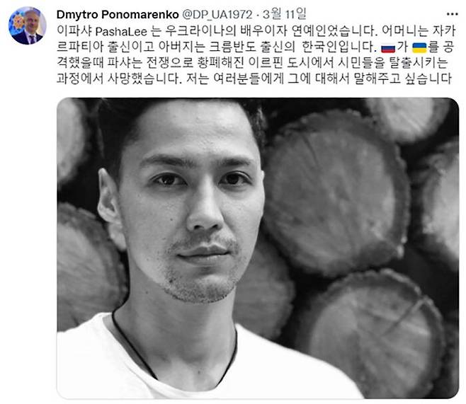 드미트로 포노마렌코 주한 우크라이나 대사는 자신의 트위터를 통해 "33살 이파샤가 전쟁으로 황폐해진 도시 이르핀에서 시민들을 탈출시키다가 사망했다"라고 밝혔습니다.