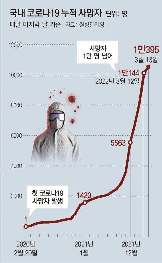 국내에서 신종 코로나바이러스 감염증(코로나19)으로 인해 숨진 사람이 1만 명을 넘었다. 이들 중 20%가량인 2001명이 최근 열흘 새 숨졌다. 주말에도 하루 38만 명 넘는 확진자가 나오는 등 확산세가 꺾이지 않자 의료계에선 5월까지 1만∼3만 명이 추가로 코로나19로 목숨을 잃을 수 있다는 우려 섞인 전망이 나오고 있다.