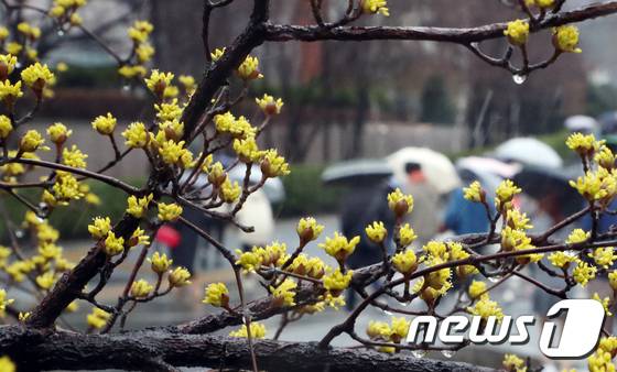 (서울=뉴스1) 김명섭 기자 = 봄을 재촉하는 비가 내린 14일 서울 서초구 보행로 옆에 노란 산수유가 꽃망울을 터트려 봄 풍경을 자아내고 있다. 2022.3.14/뉴스1