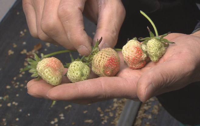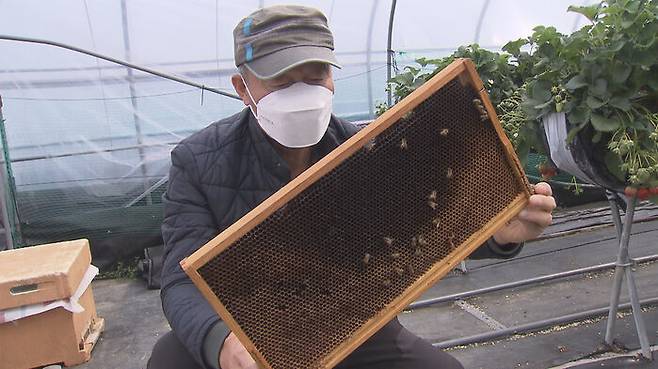 지난해 12월쯤 꿀벌이 집단으로 사라지면서 딸기 농사에 불똥이 튄 거다. 비닐하우스 1동마다 벌통 1개씩을 놓고 딸기꽃 수정을 시키는데, 벌통 안에 꿀벌이 거의 없다. 갑자기 꿀벌이 사라져 벌을 구할 수 없어서 생긴 일이다. 꿀벌 대신 바람에 꽃가루가 날려 수정이 되다보니 상품성 없는 기형 딸기가 나왔다.