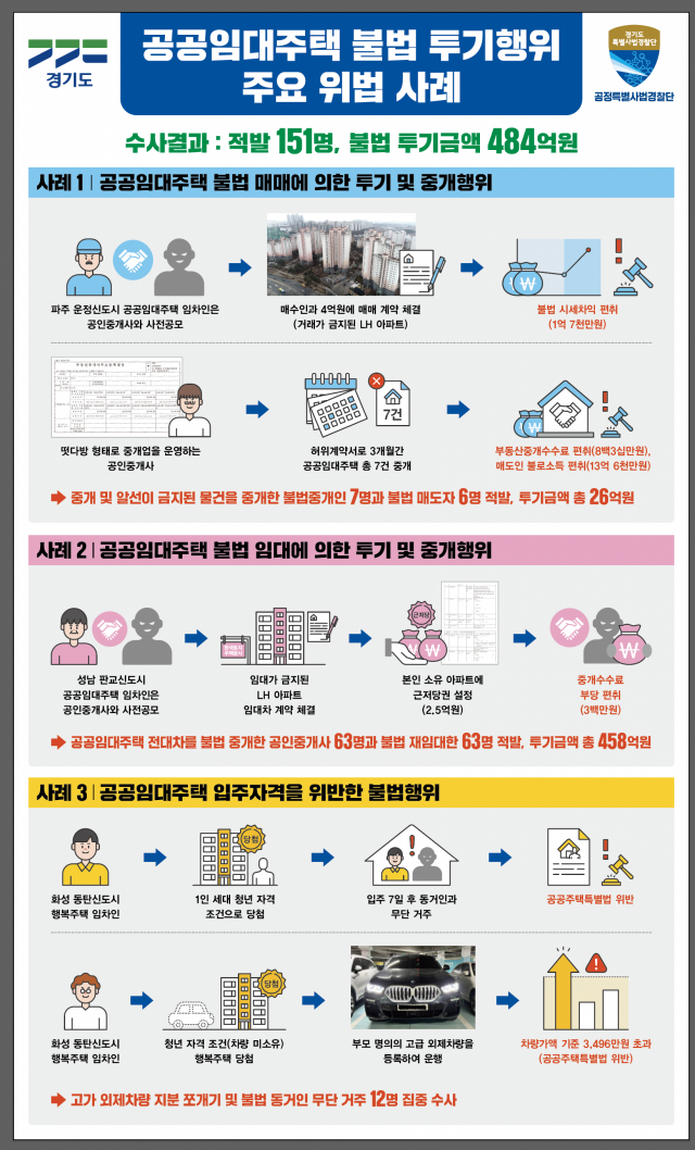 매매나 재임대가 금지된 공공임대주택 시세차익을 노리고 불법으로 매매·임대한 불법 투기자와 공인중개사, 입주자격 위반행위자 등 151명이 경기도 특사경에 적발됐다. 이들이 투기한 금액은 484억원에 달한다.