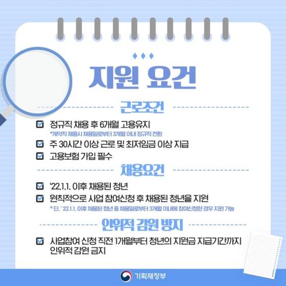 - 사업 참여 신청 직전 1개월부터 청년의 지원금 지급 기간까지 인위적 감원 금지