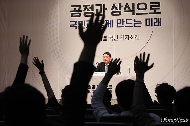 | ▲ 29일 오후 서울 서초구 매헌 윤봉길 의사 기념관에서 열린 윤석열 전 검찰총장 대선출마 선언 기자회견에서 기자들이 질문을 위해 손을 들고 있다. |