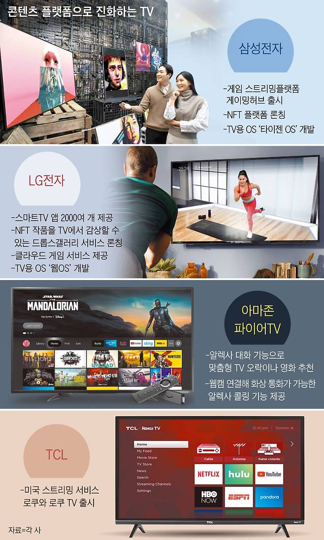 TV가 가전을 벗어나 다양한 면모를 갖추며 진화하고 있다. 방송 시청만 하는 것이 아니라 게임과 NFT 거래, 운동, 영상통화까지 할 수 있는 플랫폼으로 변신하고 있다. 방송사가 일방적으로 송출하는 콘텐츠를 재생하는 수단에서 벗어나 인터넷과 연결된 TV 중심의 새로운 콘텐츠와 생태계가 속속 등장하고 있다. 대화면과 화질 향상에 주력하던 TV 제조사들은 OTT(온라인 동영상 서비스)를 비롯한 소프트웨어와 콘텐츠 확보에 열을 올리고 있다. 플랫폼 업체가 직접 스마트 TV 제작에 뛰어들기도 한다.