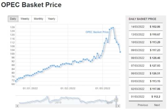유가의 흐름이 어떻게 움직이고 있는가를 살펴볼 수 있는 지표인 오펙 바스켓 프라이스, 산유국들의 원유 가격을 보면 지난 9일 128.46달러로 정점을 찍은 뒤 하락세를 지속하는 것을 볼 수 있고요.