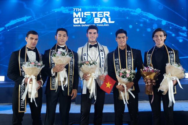 지난 15일 태국 중부에 있는 교육도시 마하사라캄에서 열린 '2021 Mister Global(미스터 글로벌)' 선발대회에서 3위를 차지한 신동우(왼쪽에서 두번째)가 다른 수상자들과 함께 포즈를 취하고 있다.