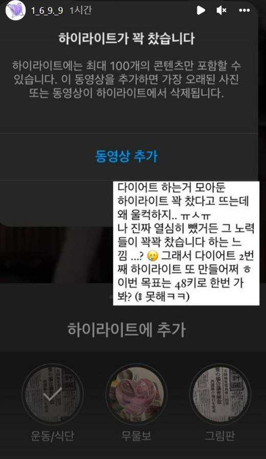 또한 그는 "다이어트하는 거 모아둔 하이라이트 꽉 찼다고 뜨는데 왜 울컥하지.. 나 진짜 열심히 뺐거든 그 노력들이 '꽉꽉 찼습니다' 하는 느낌...? 그래서 다이어트 2번째 하이라이트 또 만들었다. 이번 목표는 48kg 한 번 가 봐?(못 해)"라고 열의를 보였다.