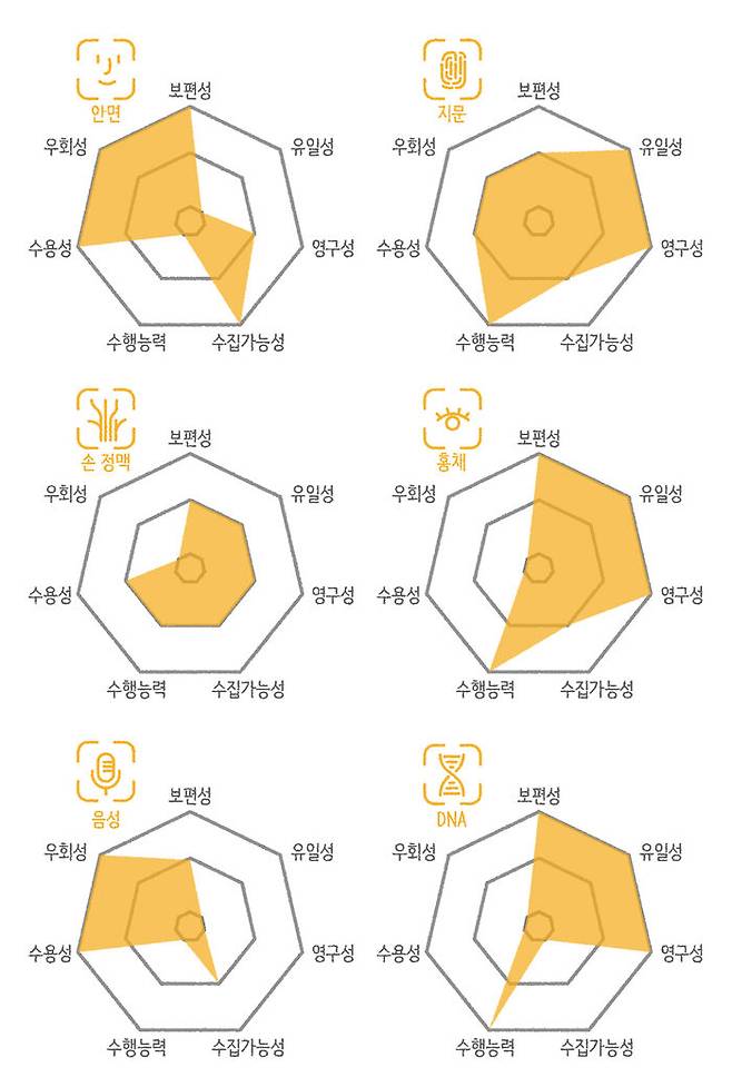 개인을 식별하는데 생체정보는 매우 유용합니다. 일단 세상의 모든 사람들이 가지고 있는 보편적인 데이터이고, 그 정보는 다른 사람과 겹칠 일없이 오로지 나만 유일하게 가지고 있죠. 게다가 변하거나 변경될 가능성도 없고, 기술 발전으로 인해 센서가 정보를 획득하기도 쉽습니다. 주요 생체정보들을 대상으로 총 7가지의 특성을 두고 시각화를 해봤습니다. 여러 생체정보 중에 현재까진 지문이 가장 무난하다고 볼 수 있어요.