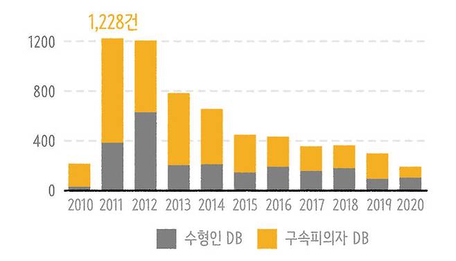 이 사건을 포함해 2010년부터 2020년까지 DNA 일치를 계기로 수사가 다시 시작된 경우가 모두 6,221건이나 됩니다. 수형인 DNA 뿐만 아니라 구속 피의자 DNA까지 활용해서 수사를 하고 있죠. 수사 재개 건수는 2011년이 1,228건으로 가장 많았고 최근엔 줄어들고 있습니다. 사건 유형별로 살펴보면 절도 사건이 4,025건으로 가장 많았고, 성폭력 사건이 996건으로 2위를 차지했습니다.