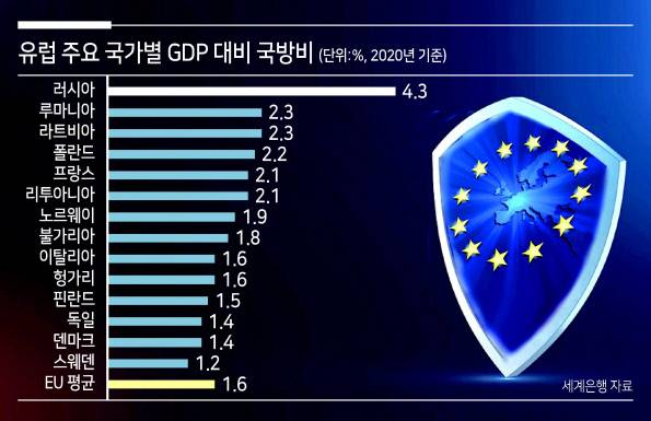 현재 유럽에서는 독일과 폴란드, 덴마크 등이 국방비 증액을 추진하고 있다. 올라프 숄츠 독일 총리는 지난달 공격용 드론과 최신 전투기 구매 등 군사력 현대화를 위해 작년 연 국방 예산의 두 배인 1000억유로(약 134조원)를 투입하겠다는 계획을 밝힌 바 있다.