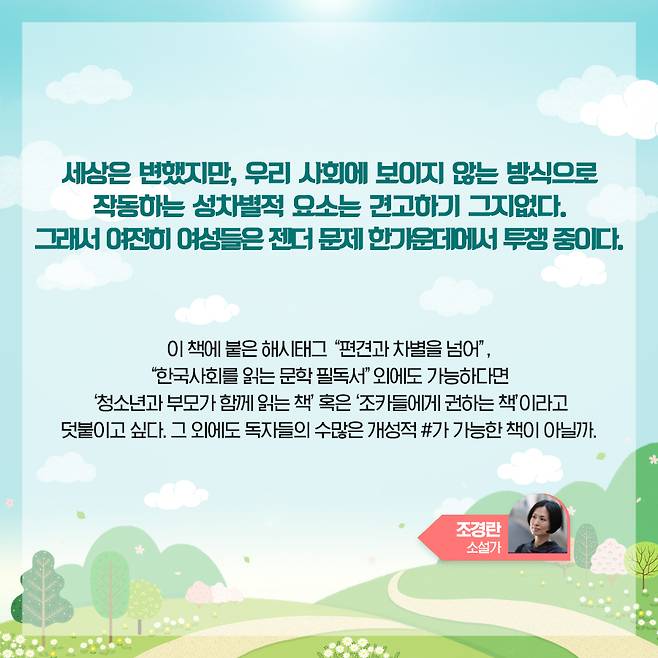 이 책에 붙은 해시태그 “편견과 차별을 넘어”, “한국사회를 읽는 문학 필독서” 외에도 가능하다면 ‘청소년과 부모가 함께 읽는 책’ 혹은 ‘조카들에게 권하는 책’이라고 덧붙이고 싶다. 그 외에도 독자들의 수많은 개성적 #가 가능한 책이 아닐까. 이 신선한 큐레이션은 시대적 주제의 첨예함을, 섬세한 언어로 써내려간 여성 문학작품으로 독자들에게 생생하게 전달할 수 있을 것이다.