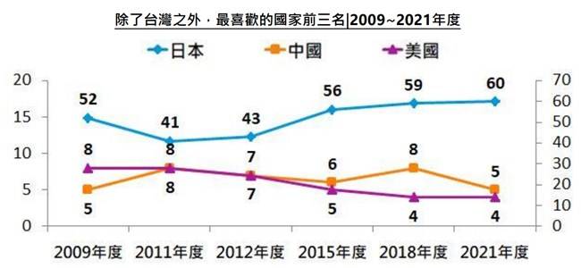 대만인들이 가장 좋아하는 국가로는 1위 일본(약 60%), 2위 중국(5%), 3위 미국(4%) 순으로 나타났다. 협회는 이전 설문조사 결과에서 나타난 순위와 변동은 없으나 일본을 택한 비율이 늘어난 반면 중국과 미국의 차이가 좁혀졌다고 했다. 연령별로 살펴보면, 50~64세에서만 일본에 대한 선호도가 약간 줄어든 반면 59세 이하 및 65세 이상에서 절반 이상이 일본을 선호하는 것으로 나타났다. 특히 30~39세에서 일본을 좋아한다고 답한 비율이 가장 높았다. 지난 2018년 조사와 비교하면, 40~49세에서 16%p 늘어나 가장 높은 증가율을 보였다.