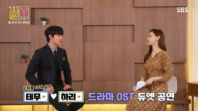 SBS '사내맞선은 얼굴 천재 능력남 CEO 강태무(안효섭 분)와 정체를 속인 맞선녀 직원 신하리(김세정 분)의 스릴 가득 '퇴사 방지' 오피스 로맨스로, 10% 시청률을 돌파하마 월화드라마 1위를 차지하며 순항 중이다.