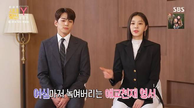 또 설인아는 김민규의 멍뭉美에 대해 "오빠는 눈빛에서 발사되는 '나를 사랑해주세요' 메시지가 있다. 가만히 쳐다봐도 사랑이 넘쳐난다"고 말했다. 이어 애교가 하나도 없다는 김민규를 보며 "오빠는 웃으면 애교다. 보조개 미소에 사르르 녹는다"고 단호하게 자랑해 웃음을 선사했다.