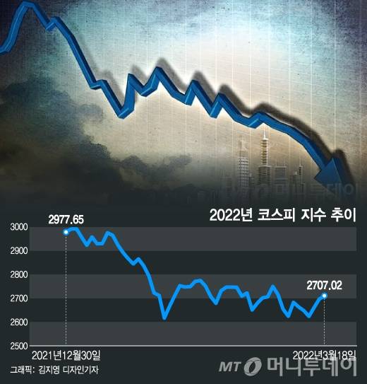 2021년 말 2999.75로 3000선 부근에서 마감했던 코스피는 올 들어 혹독한 변동성을 경험하고 있다. 미국의 급격한 금리인상 우려와 러시아-우크라이나 전쟁이라는 지정학적 위험이 겹치며 2610까지 밀렸던 코스피는 지난 주 2700선을 겨우 회복했다.
