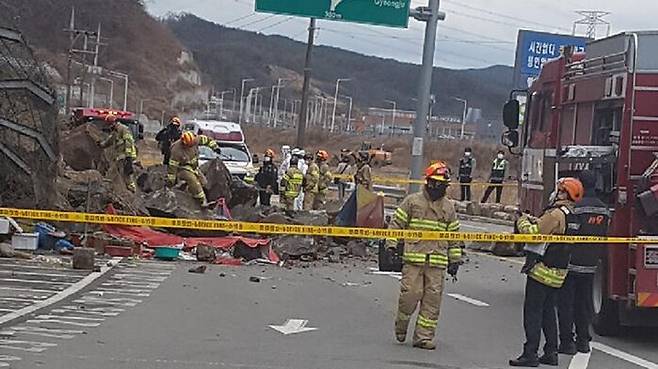 오늘(20일) 낮 12시 40분쯤 경북 경주시 문무대왕면 와음리에서 산사태가 발생해 암석이 도로 위로 쏟아졌습니다.