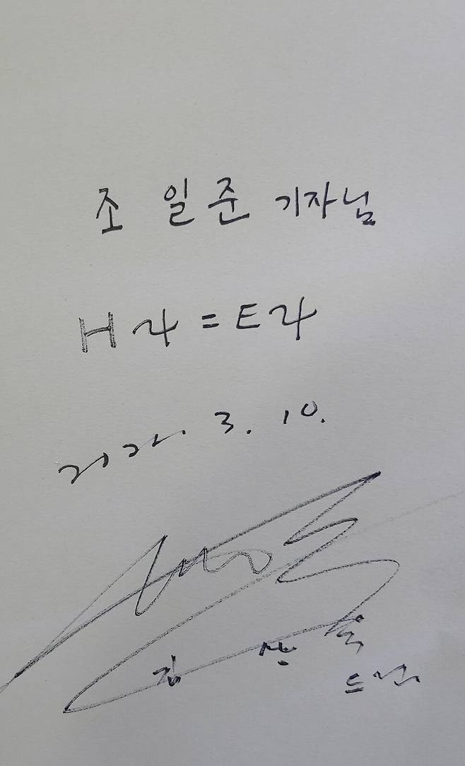 인터뷰를 마친 뒤 그의 저서 중 한 권에 저자 사인(사진)을 부탁했다. 다섯 줄 사인은 아무런 군더더기 없이 간명했다.