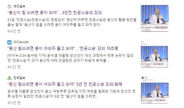 <뉴시스> 는 21일 오전 <"용산이 힘을 쓰려면 용이 여의주 들고와야"... '천공스승' 3년전 강의 SNS 달궈>라는 기사를 올렸다. 뉴시스>