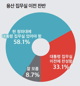 미디어토마토가 19~20일 이틀간 전국 18세 이상 성인남녀 1018명을 대상으로 실시한 여론조사에 따르면 윤 당선인이 대통령 집무실을 서울 용산에 있는 국방부 신청사로 옮기겠다는 이전 계획에 대해 58.1%가 '현 청와대에 대통령 집무실이 있어야 한다'는 의견을 피력했다.
