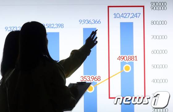 (서울=뉴스1) 김명섭 기자 = 23일 서울 송파구청에서 직원들이 신종 코로나바이러스 감염증(코로나19) 신규 확진자 전광판을 확인하고 있다. 질병관리청 중앙방역대책본부(방대본)는 23일 0시 기준 신종 코로나바이러스 감염증(코로나19) 신규 확진자가 49만881명 발생했다고 밝혔다. 누적 확진자는 1044만7247명으로 1000만 명선을 넘어섰다. 2022.3.23/뉴스1