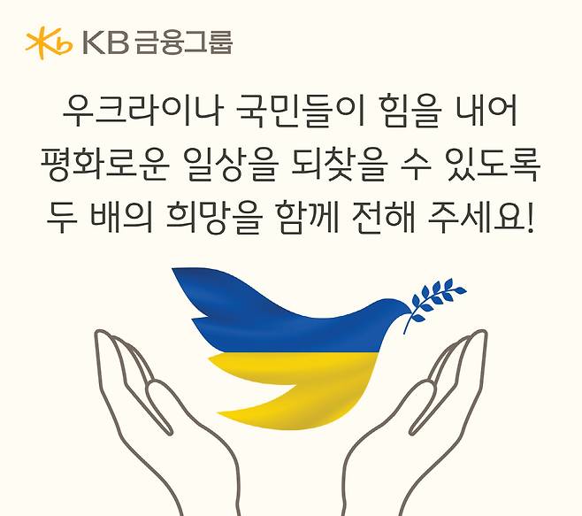 KB금융 관계자는 "전쟁으로 힘겨운 시간을 보내고 있는 우크라이나 국민들이 힘을 내는데 작은 도움이 되길 바란다"며 "앞으로도 평화로운 세계를 위해 그리고 재난으로 고통받는 분들을 위해, 기업 시민으로서의 인도적 지원과 사회적 책임을 다하겠다"고 말했다.