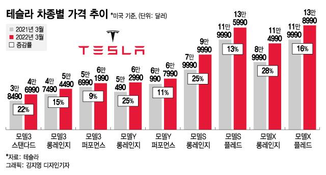 현재 국내에서 판매 중인 모델Y 롱레인지도 미국에서는 25%, 모델3 스탠다드도 22%가 인상됐다. 모델X와 모델S는 현재 국내 가격이 정해지지 않았다.
