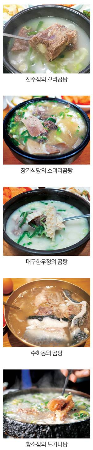 어떻게 부르든 곰탕의 정의는 고기를 넣고 오래 끓인 음식이 분명하다. 조리법만 보자면 다 비슷할 것 같은데 곰탕에는 각각 특성이 뚜렷한 여러 종류가 있다. 우선 지역적으로 나주곰탕(전남), 진주곰탕(경남), 현풍곰탕(대구), 영천곰탕(경북) 등이 유명하다. 재료에 따라선 소머리곰탕, 꼬리곰탕, 사골곰탕, 양곰탕 등으로 나뉜다. 여기다 닭곰탕, 돼지곰탕이 따라붙어 재료의 다양성까지 지니게 됐다.