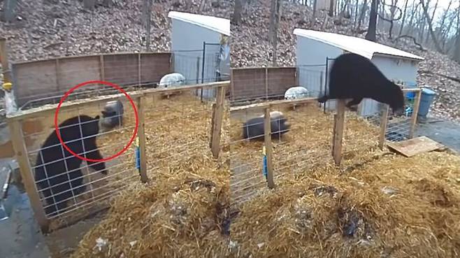 흑곰 한 마리가 돼지우리에 침입하자 안에 있던 돼지들이 달려들어 곰을 물리치는 영상이 공개됐습니다.