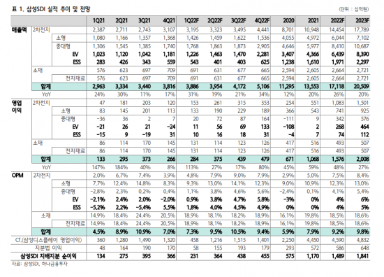 삼성SDI의 올해 1분기 매출액은 전년대비 31% 증가한 3조9000억원, 영업이익은 113% 오른 2836억원으로 예상됐다. 김현수 하나금융투자 연구원은 "반도체 공급 부족 및 러시아와 우크라이나의 전쟁에 따른 전기차 배터리 출하 감소 우려가 있었으나 기존의 보수적 전망 대비 크게 악화되지 않은 것으로 추정된다"고 설명했다.