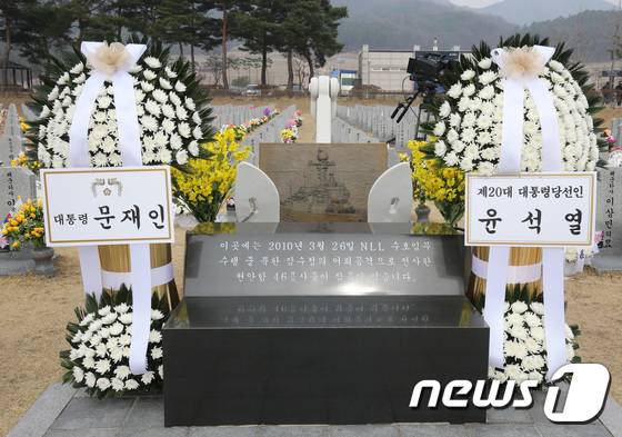(대전=뉴스1) 김기태 기자 = 25일 대전 유성구 국립대전현충원에서 열린 제7회 서해수호의 날 기념식에 문재인 대통령과 윤석열 다통령 당선인의 근조화환이 천안함 46용사 묘역에 놓여 있다. 2022.3.25/뉴스1