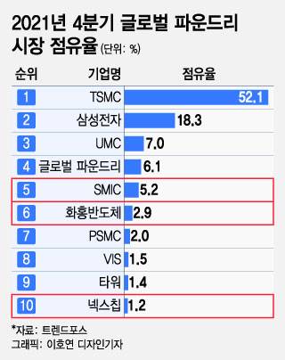 시장조사업체 트렌드포스에 따르면, 지난해 4분기 전 세계 파운드리 시장에서 중국의 SMIC, 화홍반도체, 넥스칩 등 3개사가 10위권에 진입했다.