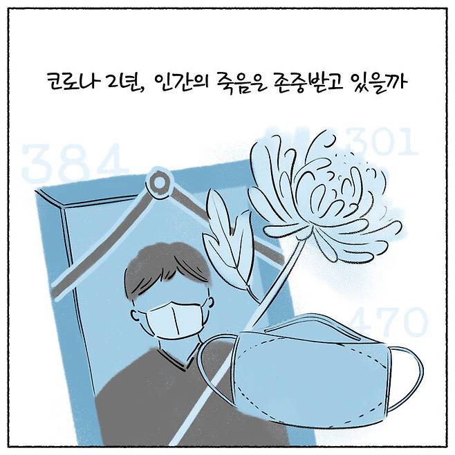 하지만 그 숫자가 고인에 대한 추모와 애도, 사랑하는 사람을 잃은 가족을 향한 위로까지 담아내진 못합니다. 아이러니하지만, 국내에서 처음 코로나 사망자가 나왔던 때(2020년 3월 20일)와 하루에 400명 안팎의 사망자가 나오는 지금을 비교하면 처음과 같은 충격과 두려움은 많이 사라졌습니다. 매일 코로나 확진자, 위중증 환자, 사망자의 숫자를 비교 분석하는 기사를 쓰고 있는 저 스스로도 많이 무뎌졌단 반성이 듭니다.