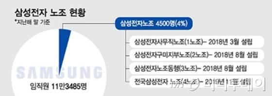 현재 삼성전자에는 총 4개 노조가 설립돼 있다. 4개 노조의 전체 조합원 수는 4500여명 수준으로 알려진다. 전체 직원의 4% 규모다. 가장 규모가 큰 노조는 2019년 11월 설립된 전국삼성전자노조(4노조)로 한국노동조합총연맹 소속이다.